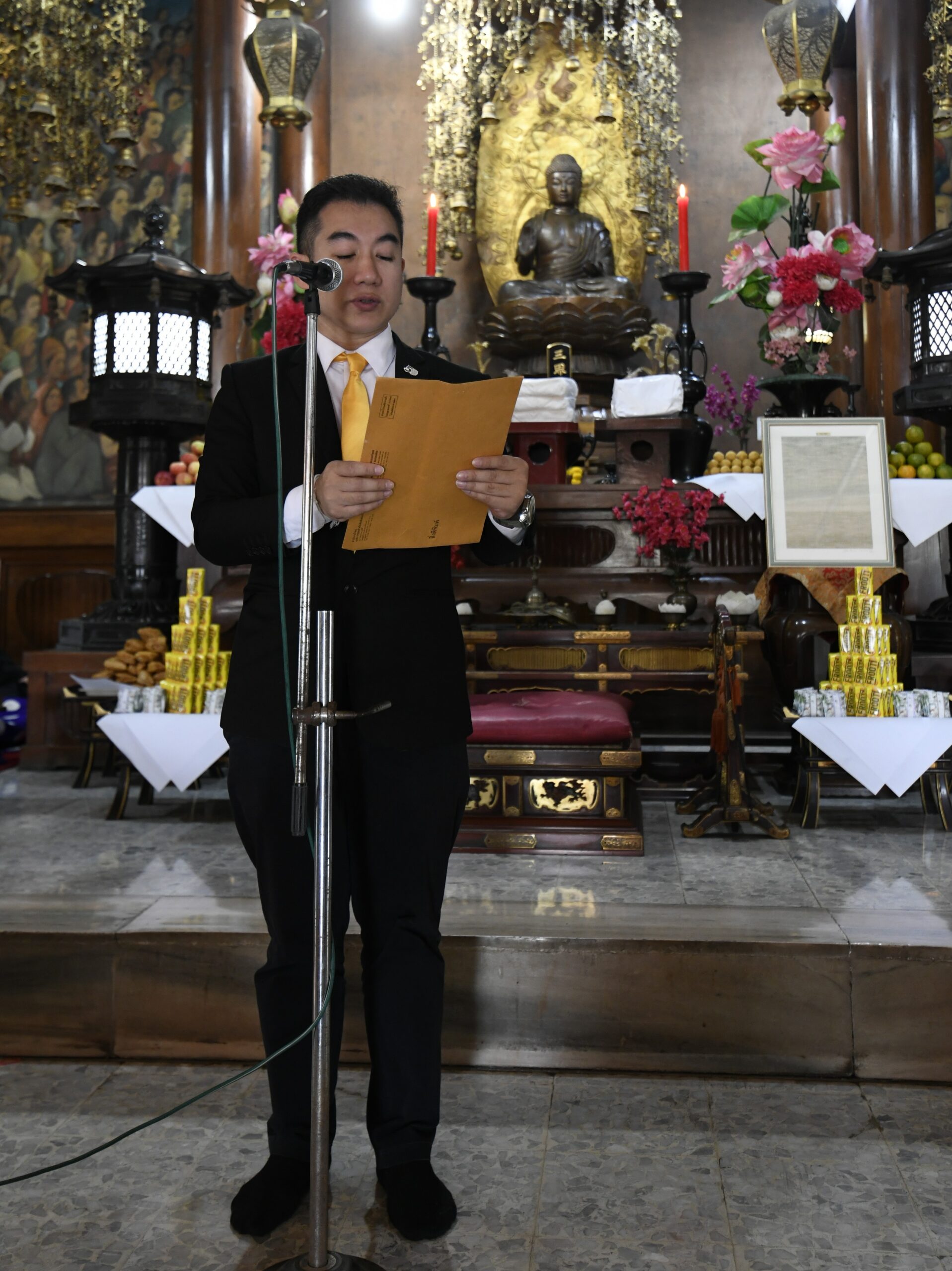 読経の後、北河原公敬日本寺竺主からの挨拶に続き、在日本コルカタ総領事中川弘一氏、世界遺産大菩提寺を管理運営する大塔管理委員会事務総長マハシュエタ・マハラッティ氏、日本寺建立当初から大きな支援をいただいている祐天寺様から現住職巖谷勝正師からの祝辞、世界仏教徒青年連盟事務総長イダノンド・タイアリー氏による世界仏教徒連盟会長の祝辞代読がなされました。