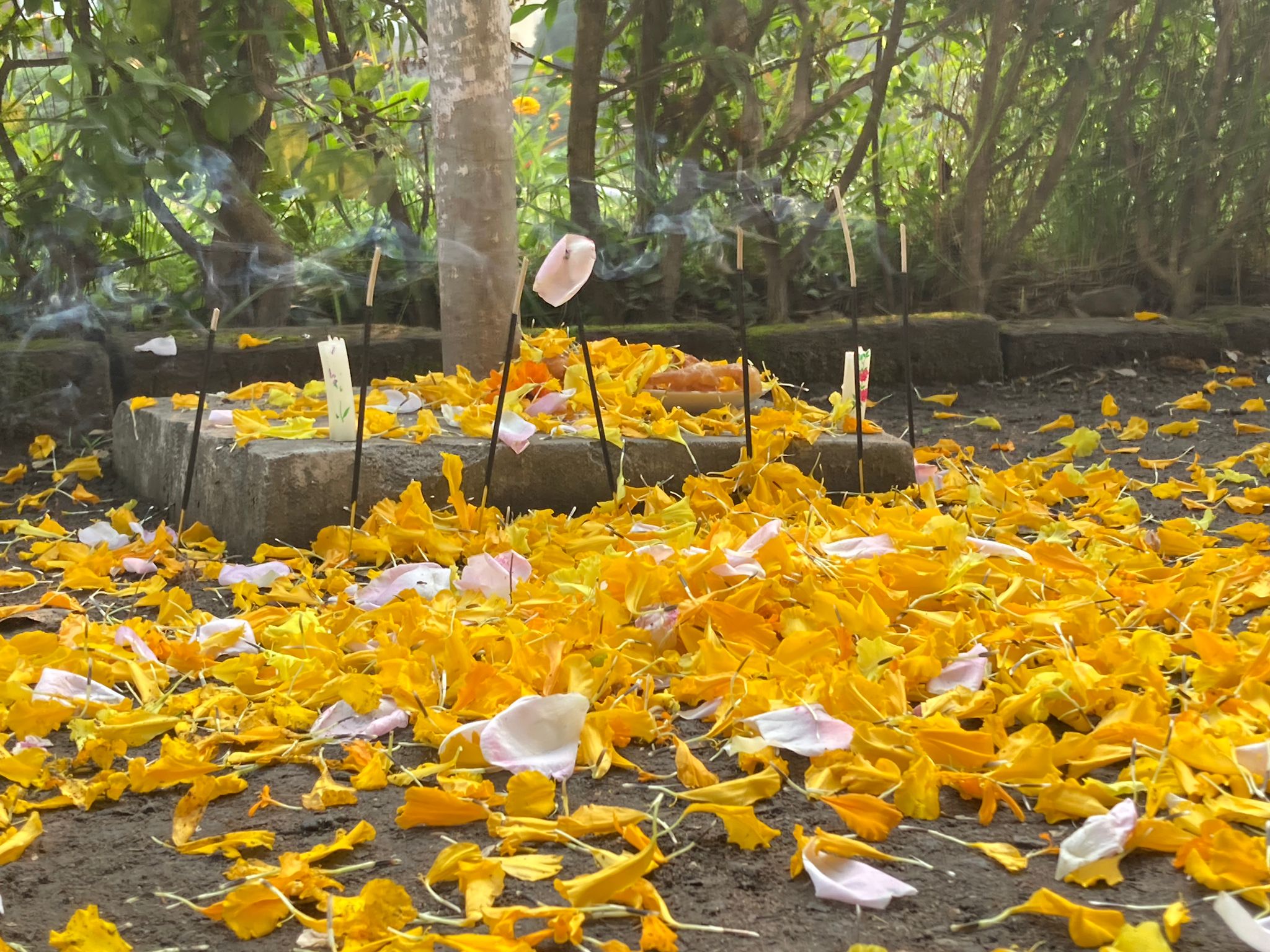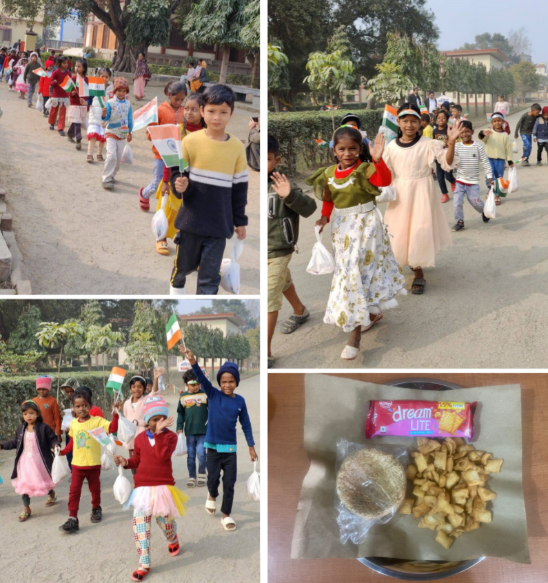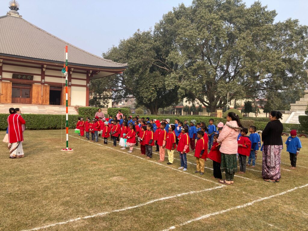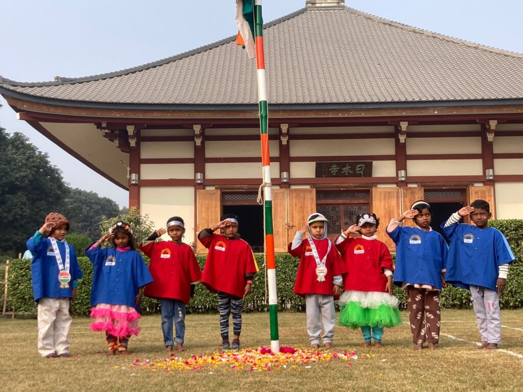 この日は日本寺、菩提学園でも国旗掲揚、国歌斉唱をしてお祝いをします。日本寺ではインド国旗、日本国旗、仏旗を掲げます。旗が上がったところで、花びらが舞うように旗に花びらをつめ細工しています。