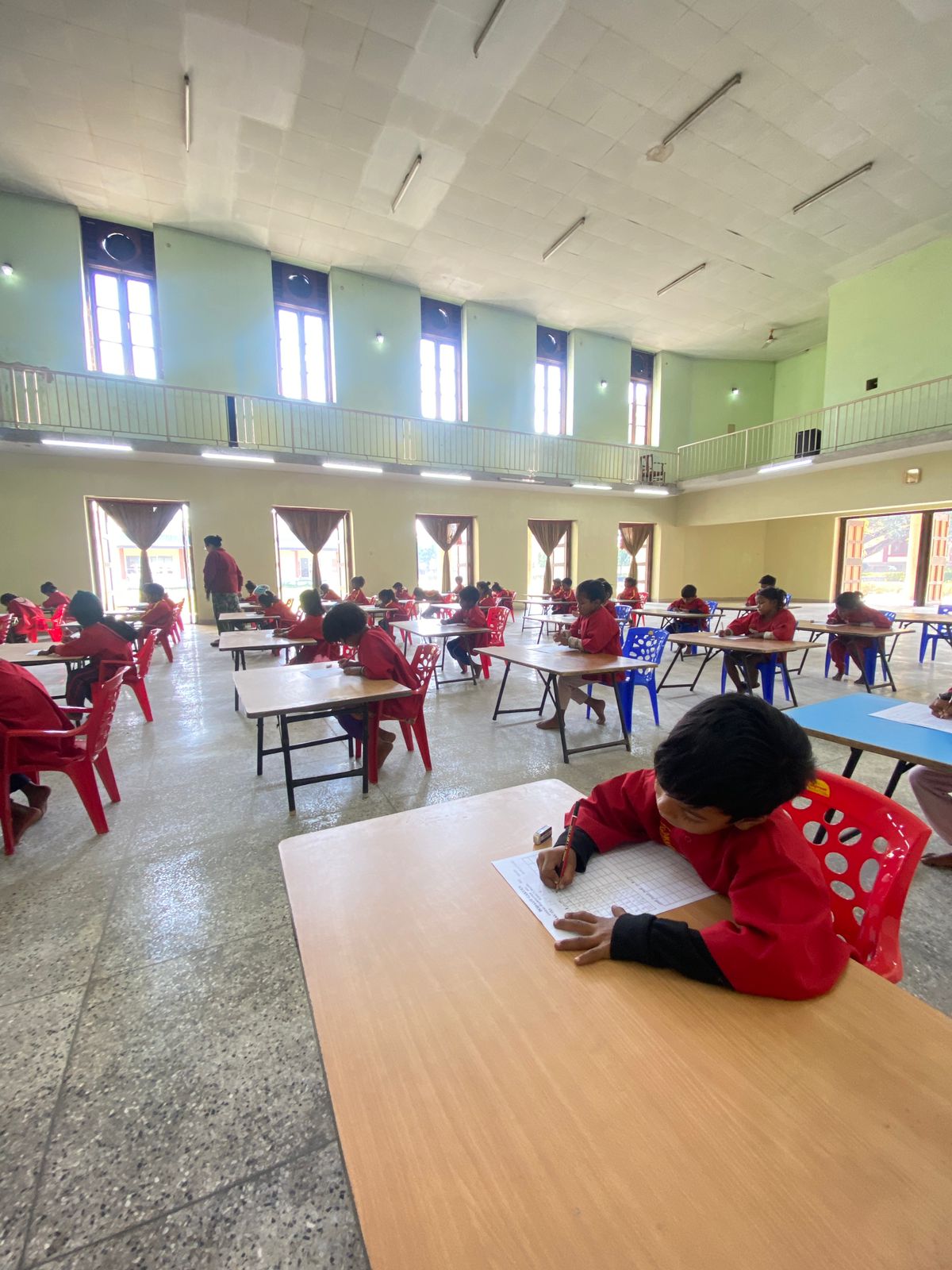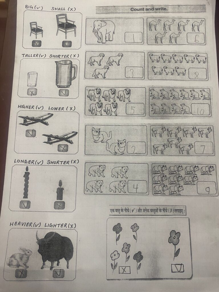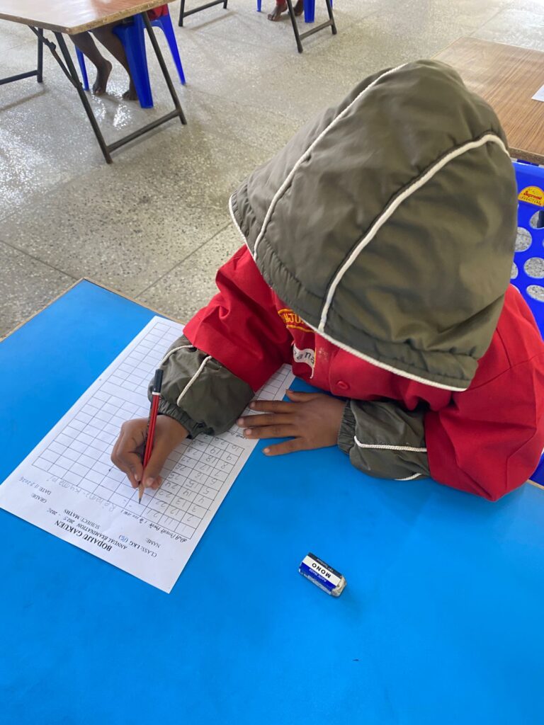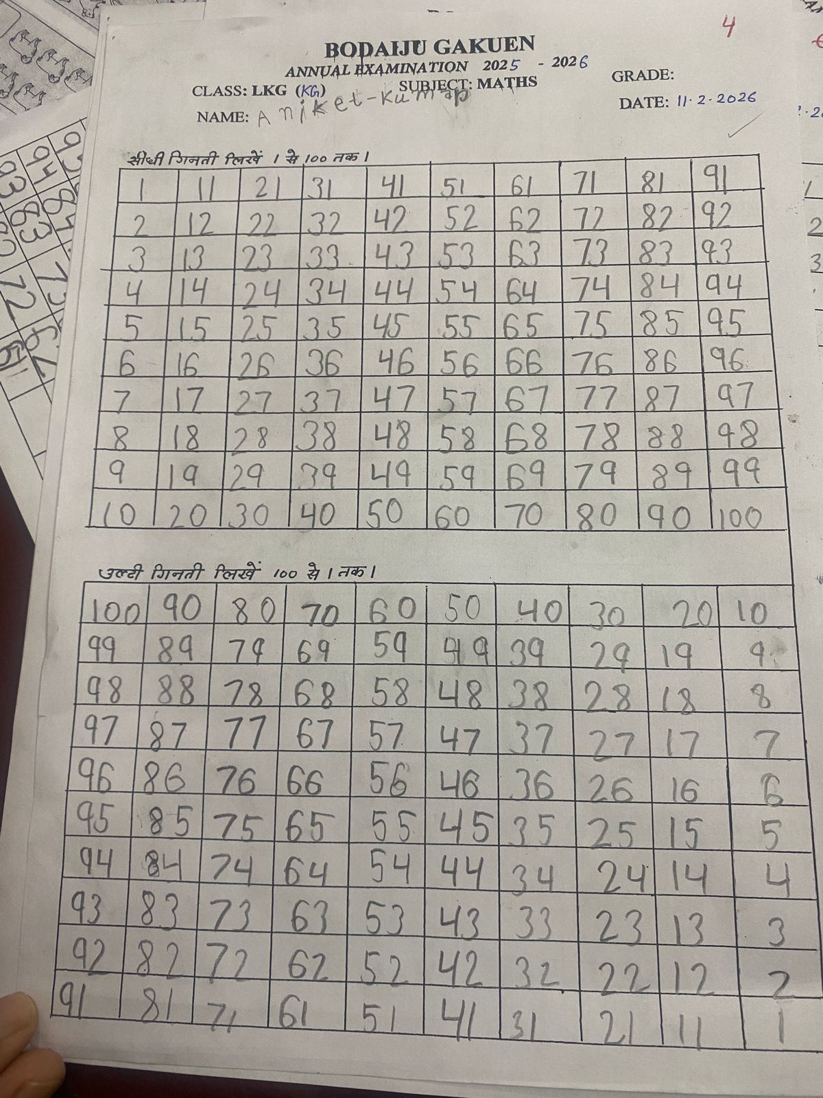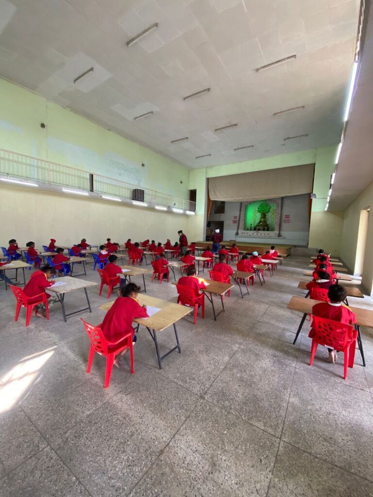 菩提樹学園年度末テスト 菩提樹学園では、2月11日年度末のテストを実施しました。 年少組にとっては1年の学びの成果を発揮する機会であり、年長組にとってはこれから小学校入学試験を受ける前の最後のテストとなります。 テストの内容は1年の学習内容から出題。年少組:1~100までの数字の筆記、ヒンディー語のあいうえお、英語のアルファベットや単語等年長組:足し算、引き算、ローマ数字、ヒンディー語・英語の単語筆記等 どの園児も一生懸命答案用紙に向かう姿が見られました。