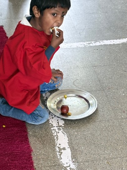 昼食には、「アルチャパ(Aloo Chapa)」、そしてインドのお祝いの日に食べるお菓子「ラスグッラ(Rasgulla)」と「グラブジャムン(Gulab Jamun)」が振る舞われ、駐在僧の私も頂戴いたしました。