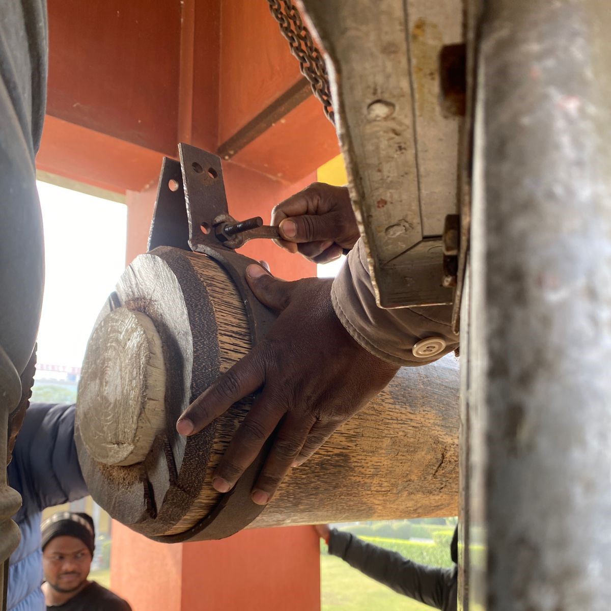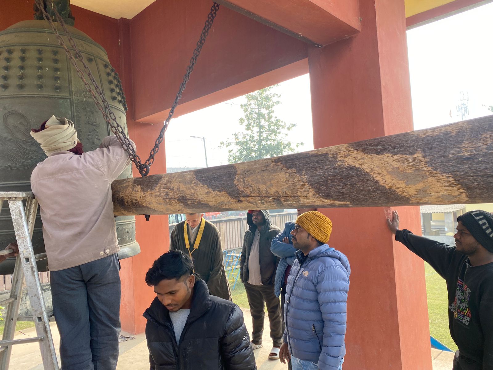 また除夜の鐘に向けて、長年のお勤めでかなり痛んでいた撞木(鐘を撞く為の丸太)の修理も行いました。いつも日本寺のいろいろな修繕をして下さっている地元の大工さんの手により新たな撞木が用意されました。かなり重たい丸太で設置の際はスタッフ総動員で担いでの作業でした。ちょうどいつも鐘の鳴る正午に工事が完了したので、スタッフや大工さんそれぞれ1回ずつ12回の試し撞きで音の確認をし、みな新しい音に満足な様子でした。古い撞木はこの後解体され菩提樹学園の給食の煮炊きに使われお役目を終えます。