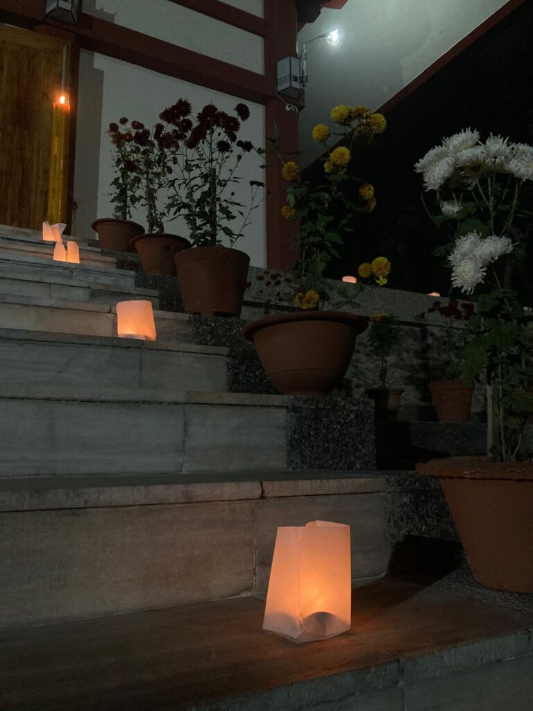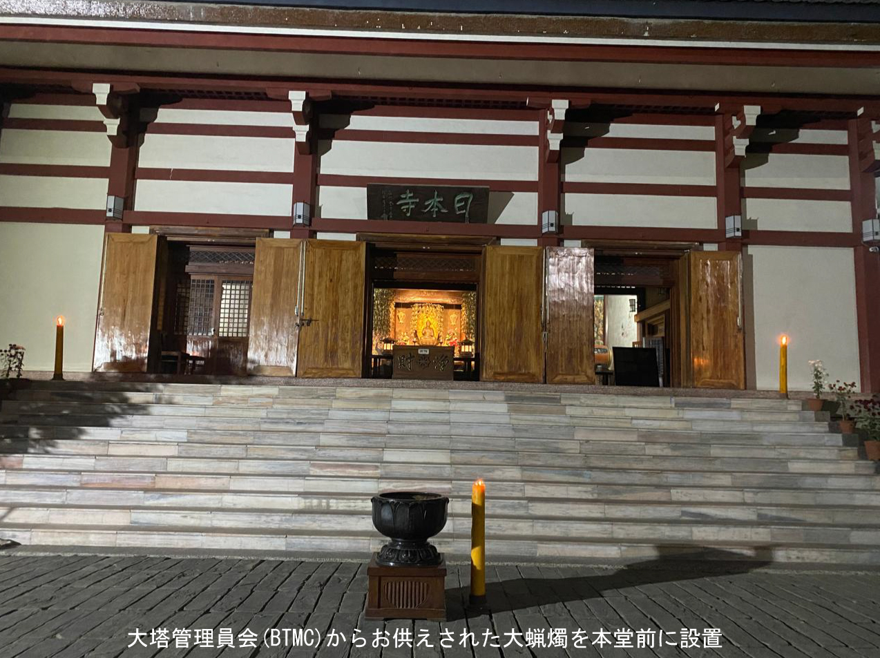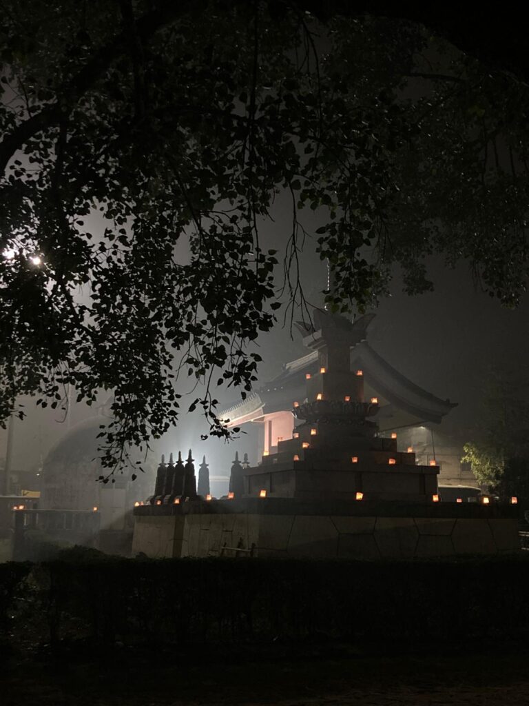 お寺の周りでは打ち上げられる花火や大音量でかかるインドの音楽によって賑やかな様子で、日本寺の灯籠の仄明かりかりの中梵鐘が響き渡る落ち着いた雰囲気は対照的でしたが、緩やかな境界の中でそれぞれが同時に存在できるインドの懐の深さを感じました。
